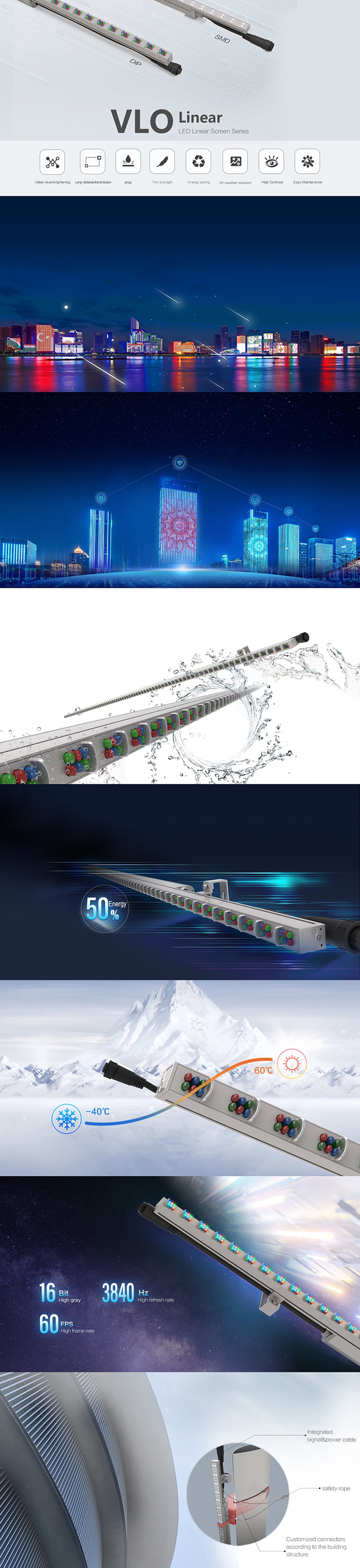LED燈條屏(又稱LED條形屏)是專為景觀建筑照明設(shè)計的一款視頻級亮化產(chǎn)品。全新自主研發(fā)設(shè)計,采用專業(yè)防水接頭多級連接組合,能組成點、線、面各種形狀顯示圖文視頻畫面。高度集成設(shè)計,外觀簡潔精美,具有輕、薄、戶外防水、無鋼結(jié)構(gòu)、免散熱設(shè)備、低功耗、集控化等特性,適用于構(gòu)建超大型戶外顯示屏,是創(chuàng)建地標動態(tài)顯示景觀的首選。