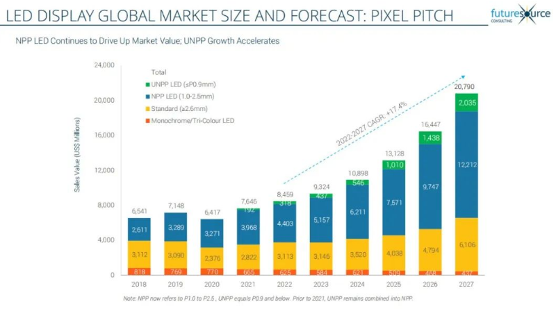 2022年,全球LED顯示行業(yè)展現(xiàn)出持續(xù)增長(zhǎng)的強(qiáng)勁勢(shì)頭。Futuresource報(bào)告顯示,2022年全球LED顯示市場(chǎng)達(dá)到85億美元,與2021年相比增長(zhǎng)了10.6%。Futuresource預(yù)計(jì)2023年全球LED市場(chǎng)的收入將增長(zhǎng)10.2%,達(dá)到93億美元。五年預(yù)測(cè)顯示,到2027年,復(fù)合年增長(zhǎng)率(CAGR)將達(dá)到17.4%,市場(chǎng)規(guī)模將增至208億美元。利亞德作為國(guó)家制造業(yè)單項(xiàng)冠軍,對(duì)顯示行業(yè)未來(lái)發(fā)展充滿信心。